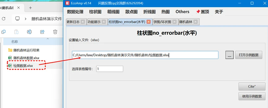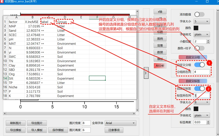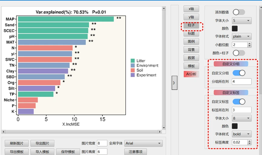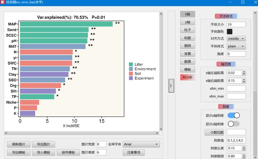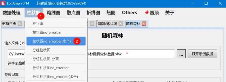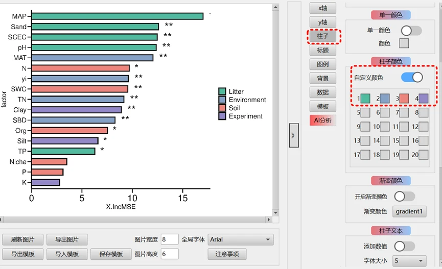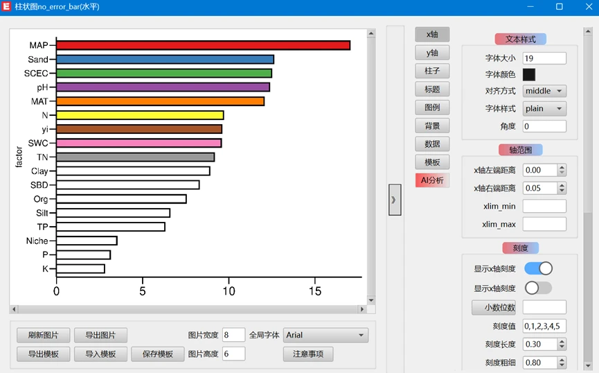 模板文件使用方法,左下角 选择 导入模板的按钮之后,会弹出一个对话框,选择对应的路径,选择这个模板文件 随机森林柱状图模板_水平.json 即可,然后刷新图片