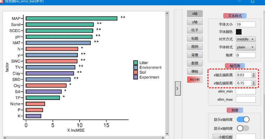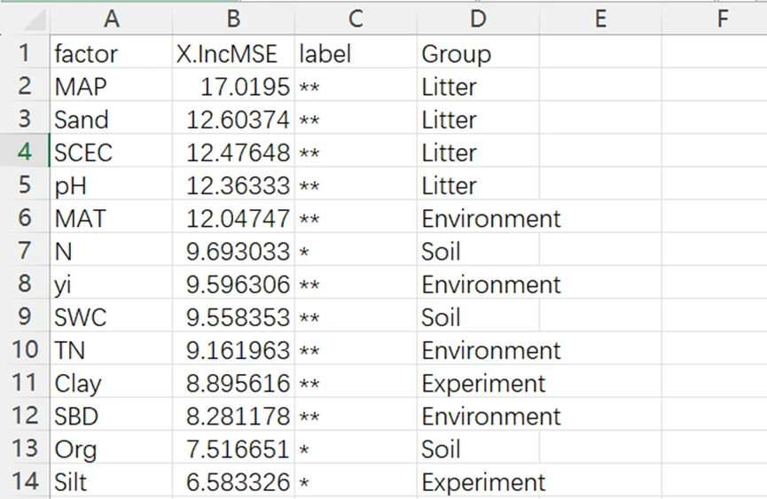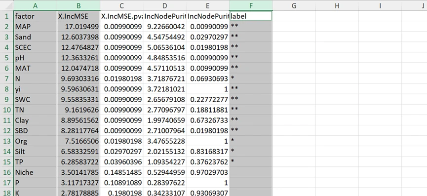 选择fatcor、X.IncMSE、label列即可。若要绘制其他指标的图形,自行选择即可